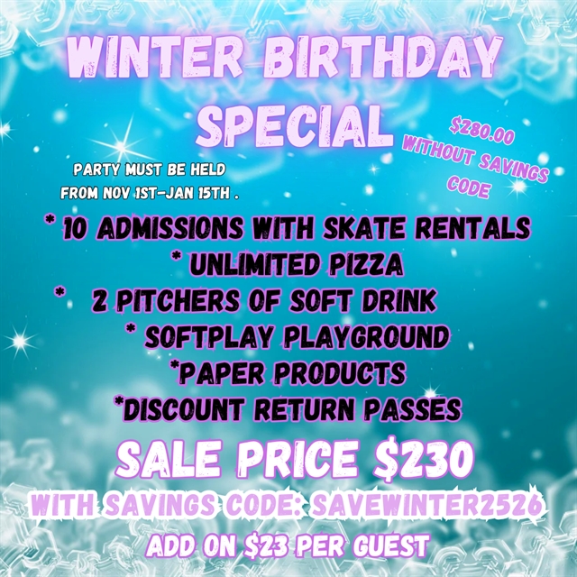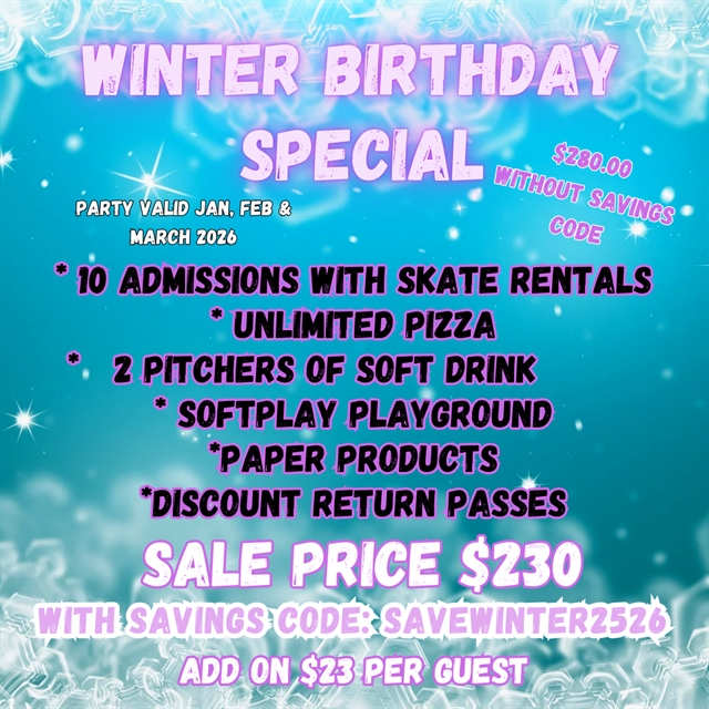 This deal must be held by January 15 2026. Party valid during any public session. If you book on a Sunday your party gets upgraded to unlimited pizza at no additional cost. Non-Skating adults on Sundays must pay $6.75 admission that includes unlimited pizza.